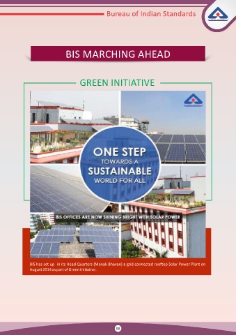 Bureau of Indian Standards BIS MARCHING AHEAD GREEN INITIATIVE BIS has set up in its Head Quarters (Manak Bhavan) a grid connected rooftop Solar Power Plant on August 2014 as part of Green Initiative. 88