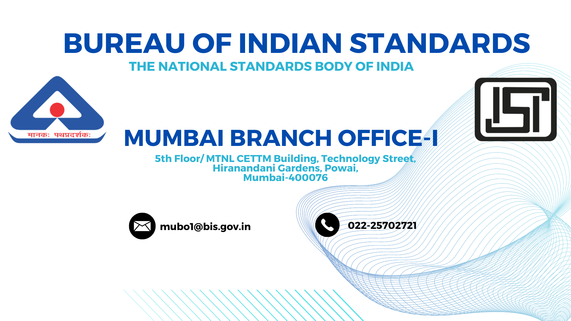 Mumbai Branch office-I (MUBO-I in official correspondence) is one of the 38 Branch offices of the Bureau of Indian Standards (BIS) - The National Standards Body of India. MUBO-I caters to the industries in 04 Districts of the State of Maharashtra (Mumbai City, Mumbai Suburban, Nashik & Palghar).